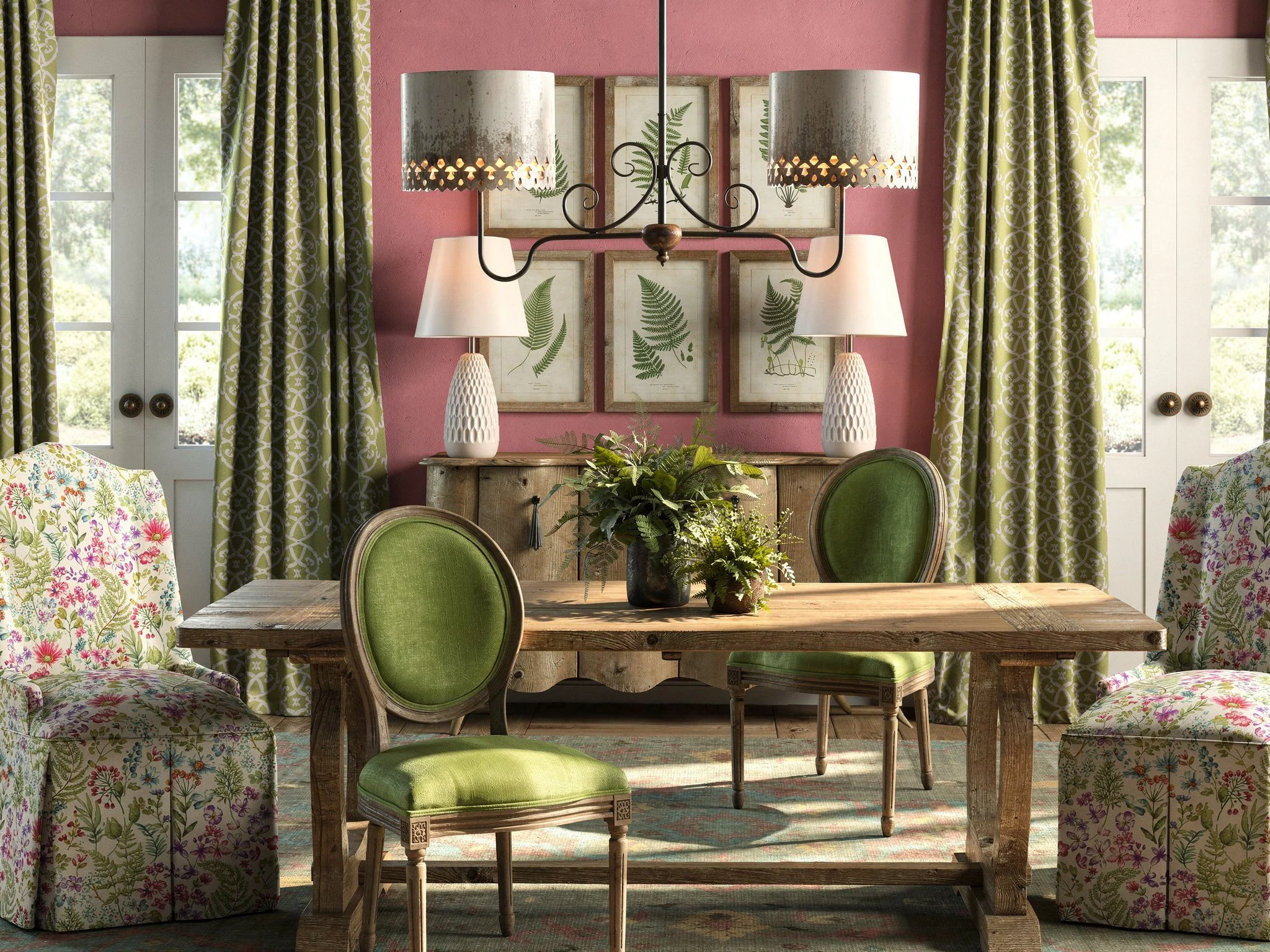 Finally, the chandelier and a set of rustic fern prints follow suit.