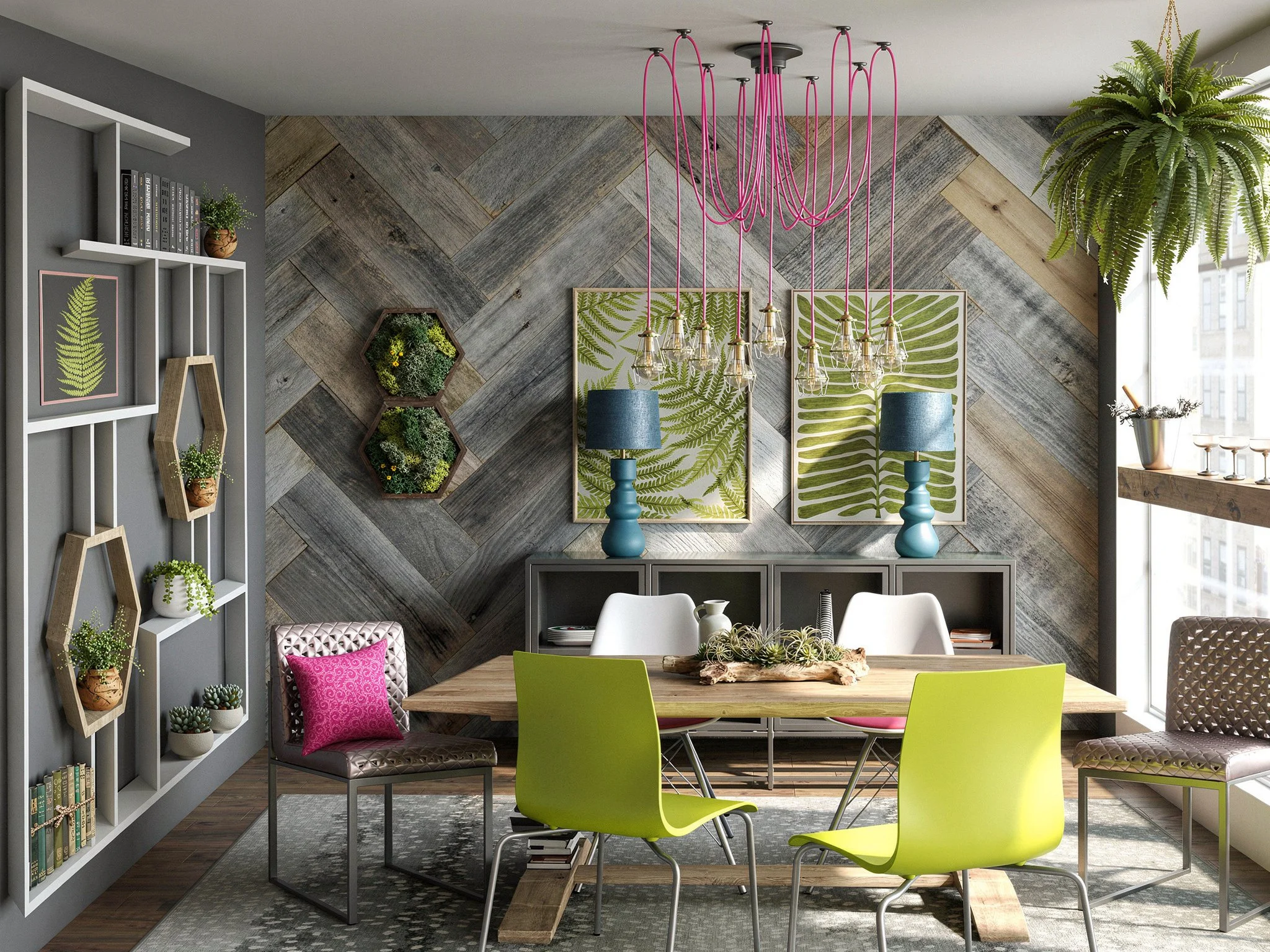 I’m using the same color palette, but this time, I’ve deepened the shade to more of a charcoal with Benny M’s toucan black. This go around, various shades of gray take the front seat- the antelope print rug, the barn board wall treatment, and the ceiling paint. Green is our secondary color, which is generously spread throughout the room with the abundant use of natural plants, two acrylic dining chairs and fern/moss wall art. Again, a hot pink, a deeper blue and white are the accent colors for this next eclectic design.